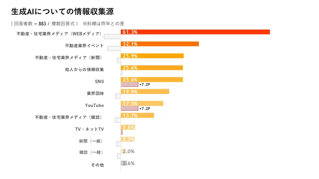 不動産DX、生成AIについての情報収集は、「不動産・住宅業界メディア(WEBメディア)」が最多で61.3%であることが分かりました。