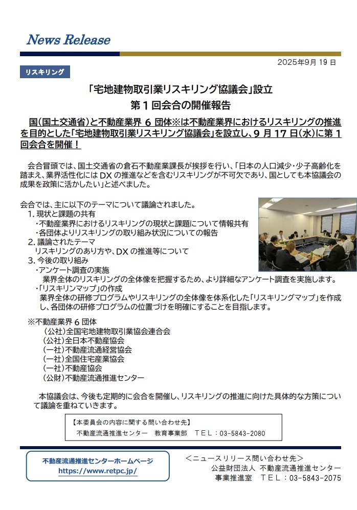 国土交通省および業界6団体は、「宅地建物取引業リスキリング協議会」を創設。17日、初会合が開かれました。