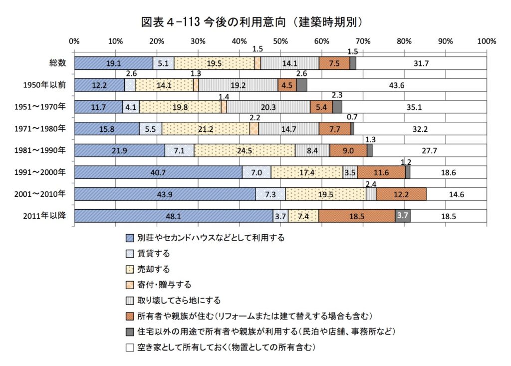 建築時期が古くなればなるほど、空き家として所有しておく利用意向が上がります。下の図の白の部分です。