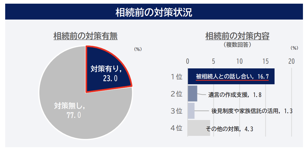 相続前に「特に対策は講じていない」の割合が約 77%に対し、「相続前に対策を講じた」は約 23%となっています。