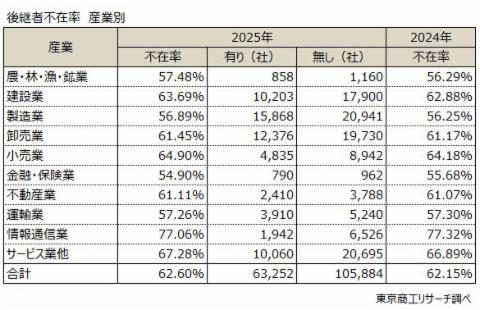 25年後継者不在率、不動産業は6割強に